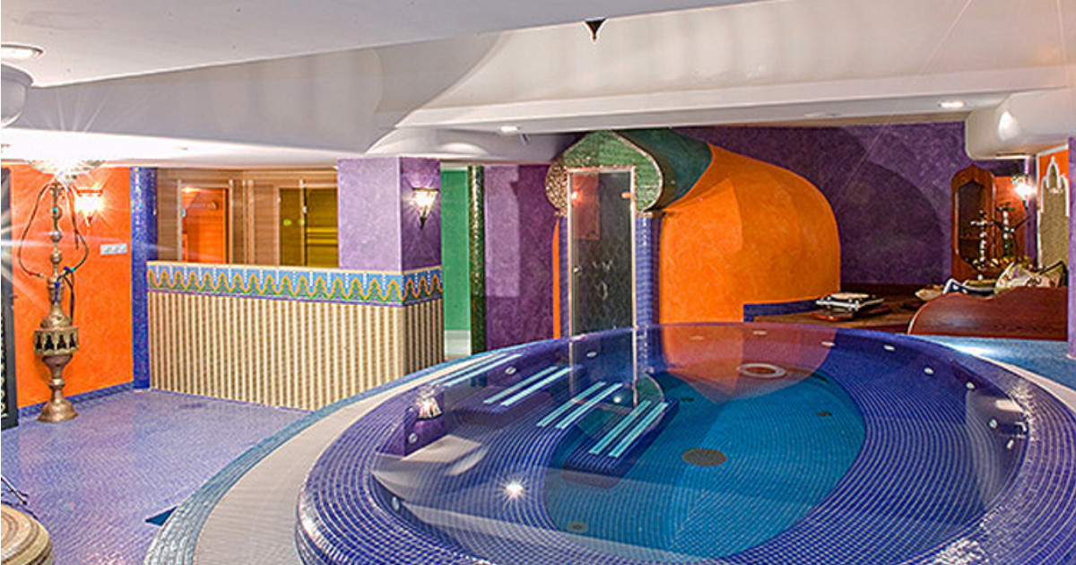A környező elemek – a díszes lámpatestek, a puha pihenőrészek és a keleti hangulatot idéző falak – tovább fokozzák a luxus érzetét. Ez nem csupán egy wellness részleg, hanem valódi élménytér, ahol a látvány és az érzések összeolvadnak.